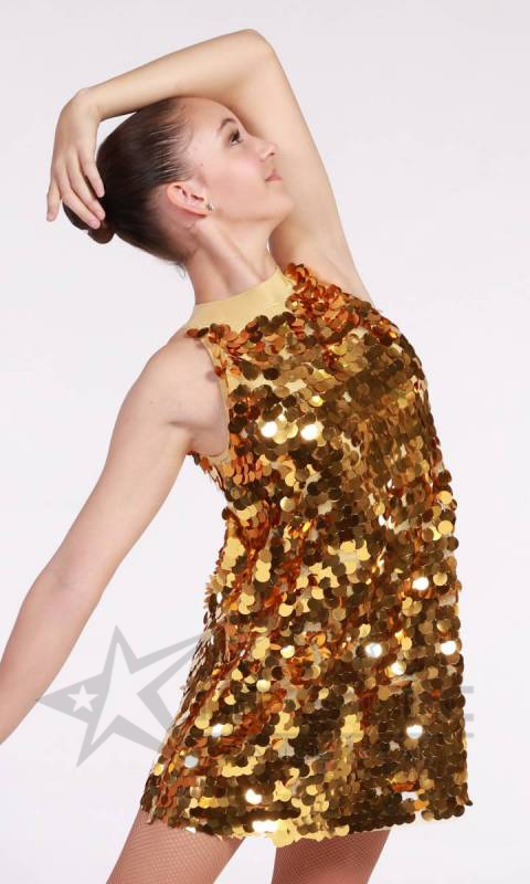 Sequin swing dress with shortard build in. Comes with headband. Difficult sequin fabric to work with, there will be an occasional sequin fall off, its not noticeable on the stage.