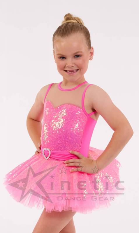 Sequin tutu with mesh yoke and heart buckle on centre front. A popular style at Kinetic Creations!