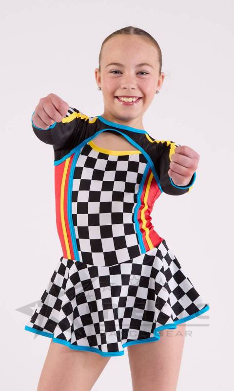 Racing inspired long sleeve dress with built in shorts. Pictured with Style 8249 Stirrup Spats in Black - sold separately.